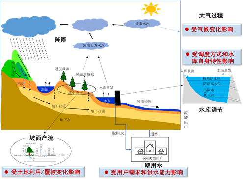 汉江流域是南水北调中线工程的水源区,同时也是陕西省“引汉济渭”、“引红济石”和湖北省“鄂北调水”工程的水源区,过去10年累计北调水超620亿m³,直接受益人口1.08亿,已成为京津冀豫26座大中城市主力水源。然而,受气候变化影响,丹江口水库近20年入库径流减少11%,预计未来30年将继续减少15%。汉江流域干旱化趋势逐渐凸显,水源区与受水区干旱遭遇概率将增加,气候变化和人类活动已成为汉江流域水资源演变的重要驱动。为实现流域精细化模拟与演化预测,提出应对大范围干旱的调水策略和风险调控措施,迫切需要开发融合大气、陆面、调水、拦蓄和用水过程的人-水系统集成建模技术。