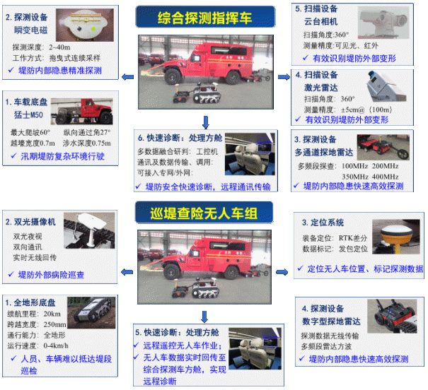 该成套技术装备包括综合探测指挥车和巡堤查险无人车组。综合探测指挥车采用全地形底盘,搭载瞬变电磁、探地雷达、激光雷达和全景摄像等先进设备,并配备数据处理方舱,可现场分析探测数据,诊断病险隐患。巡堤查险无人车组则搭载探地雷达和双光相机,能够远程无人探测人员和车辆难以抵达的堤段,并将数据实时回传至综合探测指挥车。装备通过创新电磁波技术,融合三维激光系统和云台全景摄像技术,实现了多源异构数据的同时采集、同步处理、现场解译和高效传输,1分钟可完成百米堤坝风险探测,能够快速探明管涌、散浸、崩岸等险情,有效提升了堤坝全方位性态精准感知的技术水平和防汛抢险的响应联动效率。