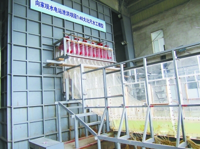向家坝水电站水工模型是基地里最耗水的项目,模型地下有一座蓄水3000吨的大水池,实验时水泵每秒抽水2.5吨,用以检验大坝水流对坝底消力池的冲击力。水泵开启,水流从3米高模型上方口倾泄而出,发出隆隆响声。骆少泽说,这个模型是1:40缩小版,3米高度相当于实际120米,等于水流从40多层大楼往下落。实验是为了寻找大坝最佳排水口的角度和尺寸,让水流在落入水池中能量相互抵消,术语称为“底流消能”。